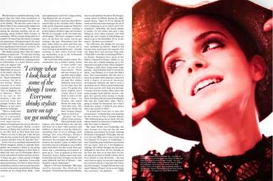Emma címlapfotóját elnézve valóban lezártnak tűnik számára a Potter-korszak, és igazi – felnőtt – nőként magabiztosan mosolyog Mario Testino fényképezőgépének objektívjébe. Mióta ezt a nagyon rövid hajat viseli, mint Mia Farrow a Rosemary gyermeké-ben, azóta még inkább a divatszakma egyik nagy kedvence lett. A fotón enyhén a 60-as évek és Twiggy hatását tükrözi a simára fésült frizura és a hajhoz passzoló, hosszúra turbózott és feketére festett szempillák, hangsúlyos szemöldök és natúr ajakfestés miatt. Az elegáns smink mellé egy nem kevésbé kifinomult és gyönyörű fehér 2010-es őszi-téli kollekcióból való Valentino-ruhát kapott a törékeny alkatú színésznő a stylisttól.